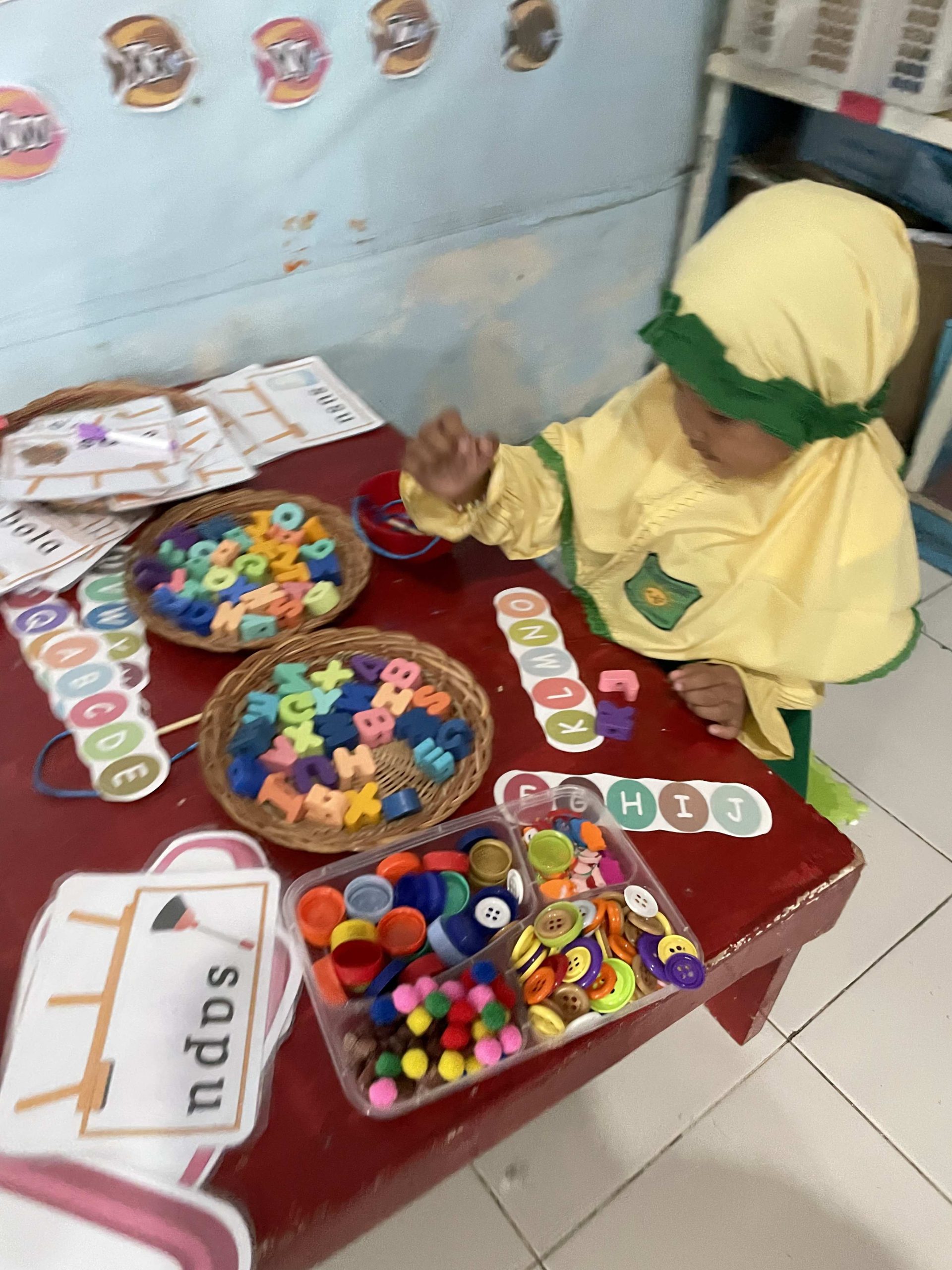 - Aktivitas: Bermain kartu huruf, mengelompokkan benda berdasarkan bentuk atau warna, menyusun pola, dan pengenalan konsep angka.